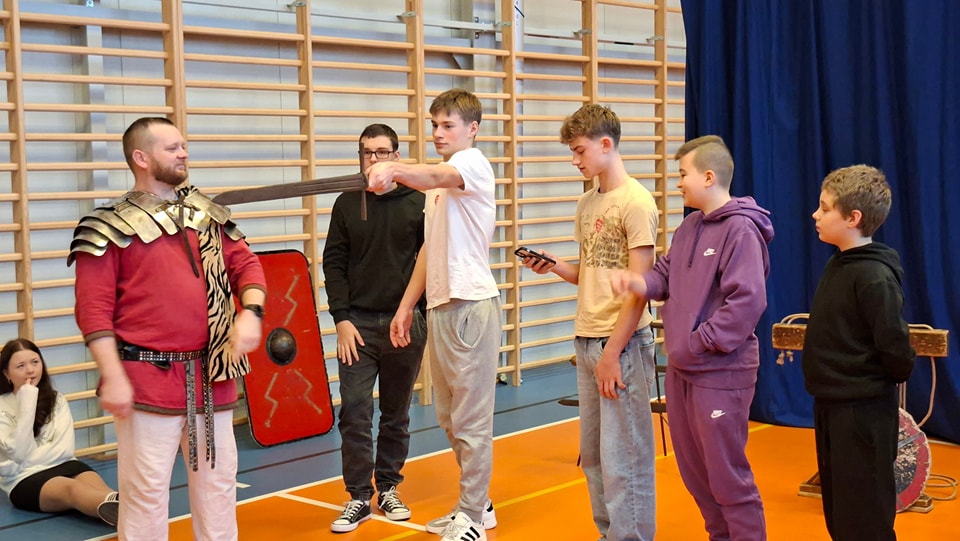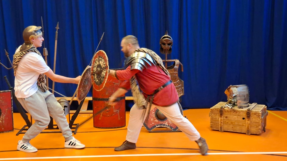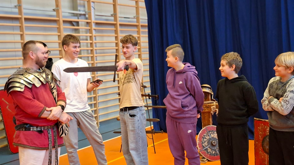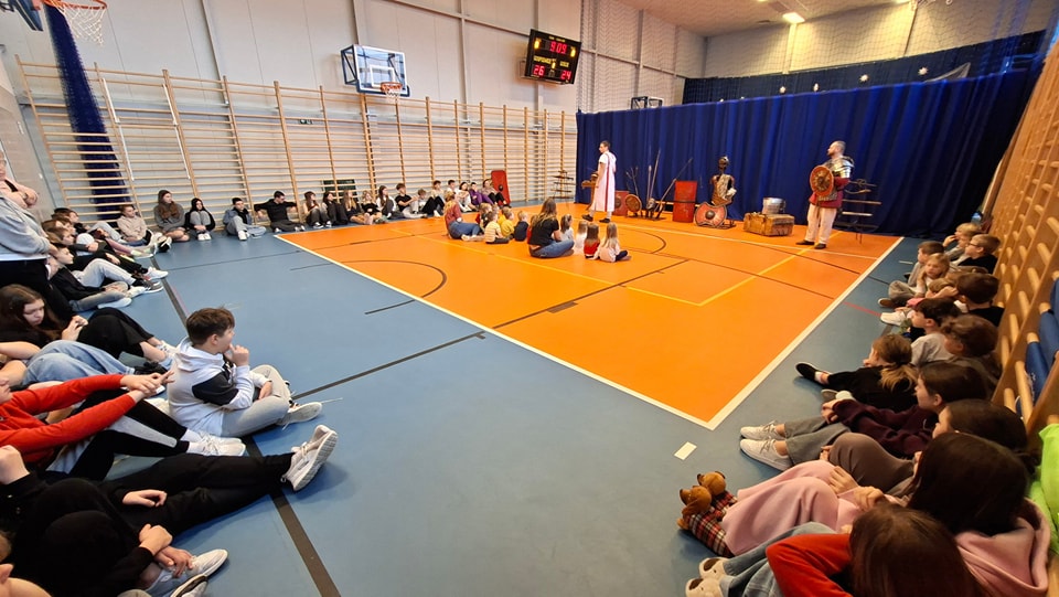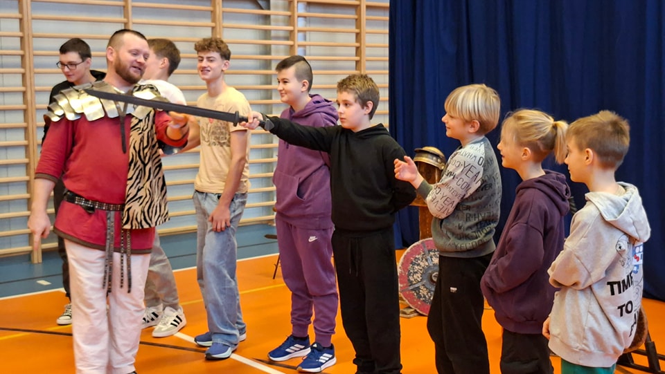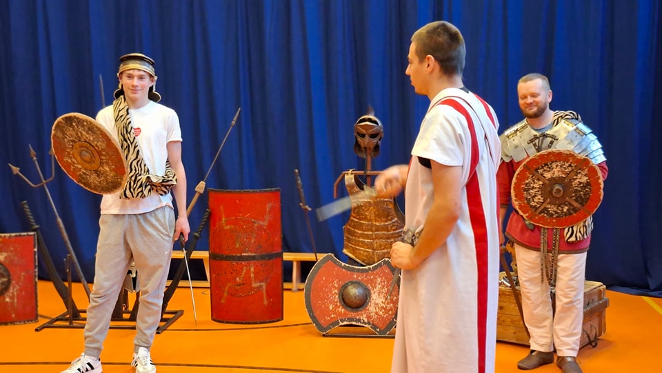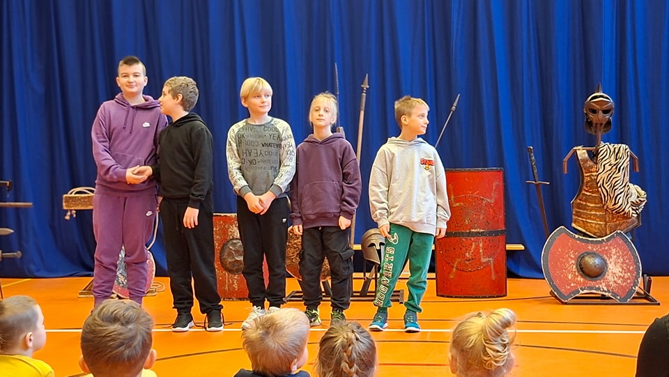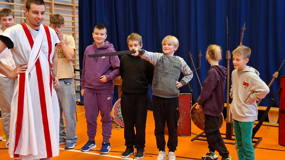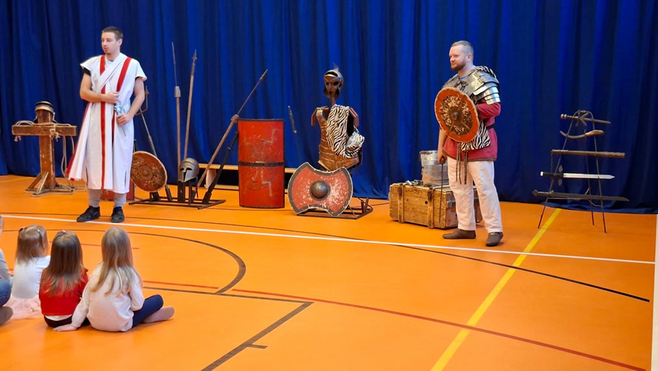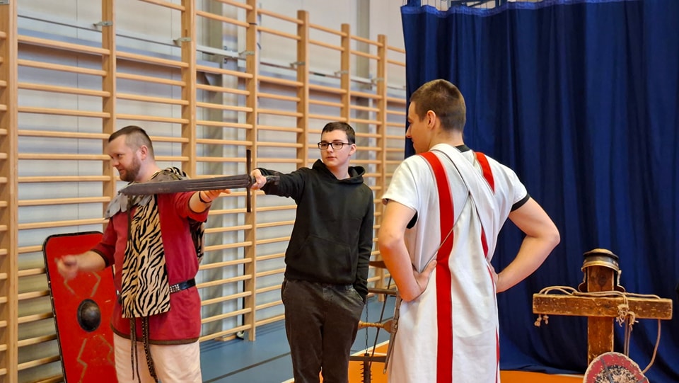 Do naszej szkoły zawitała Grupa Artystyczna Rekonstrukto, która przeprowadziła dla uczniów wyjątkową, żywą lekcję historii. Podczas spektaklu „Rzymskie Imperium i tradycje antyku” uczniowie z ogromnym zainteresowaniem poznawali dawne obyczaje i mogli w praktyczny, namacalny sposób doświadczyć kultury starożytnego Rzymu. Serdecznie dziękujemy za niezwykle ciekawe zajęcia! Panująca cisza i pogodna atmosfera były najlepszym dowodem na to, jak bardzo ta lekcja zaciekawiła naszych uczniów 🙂