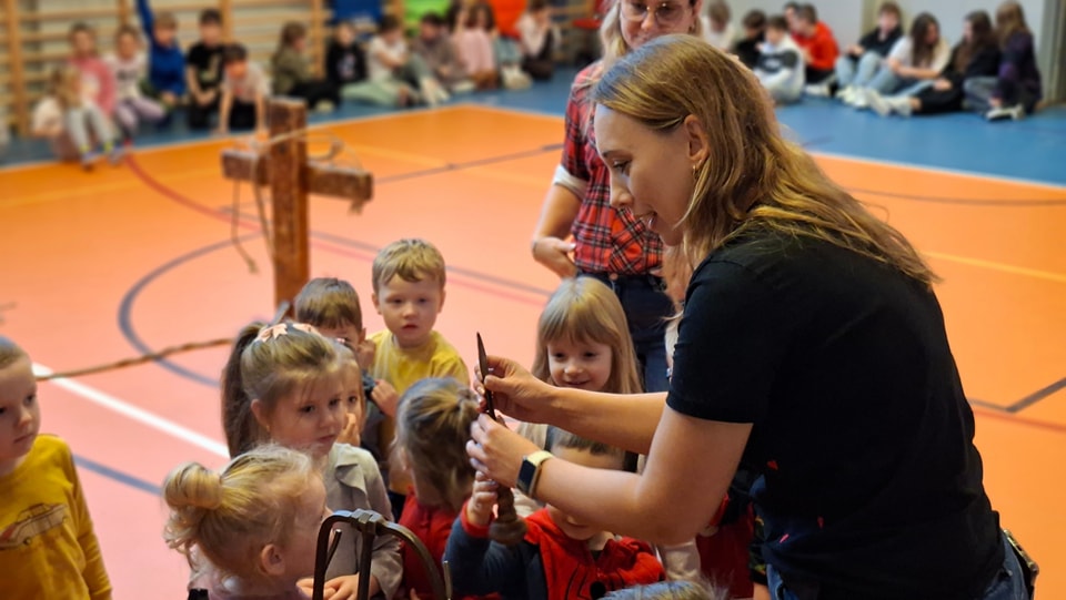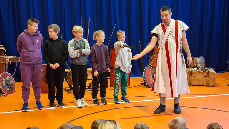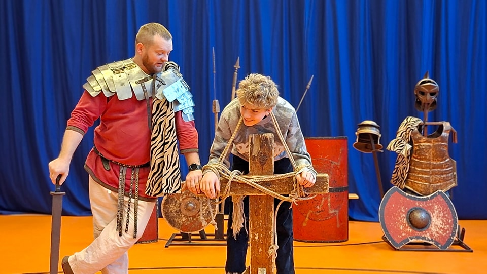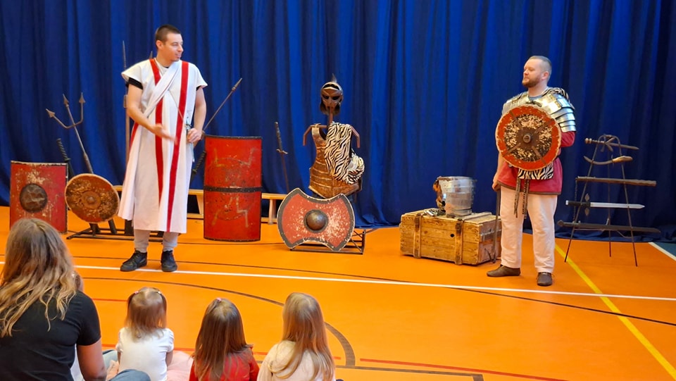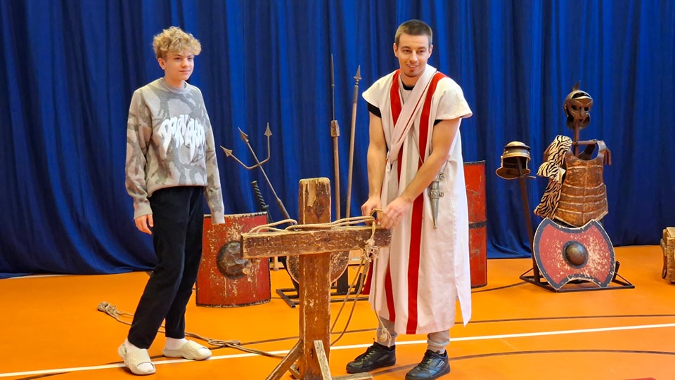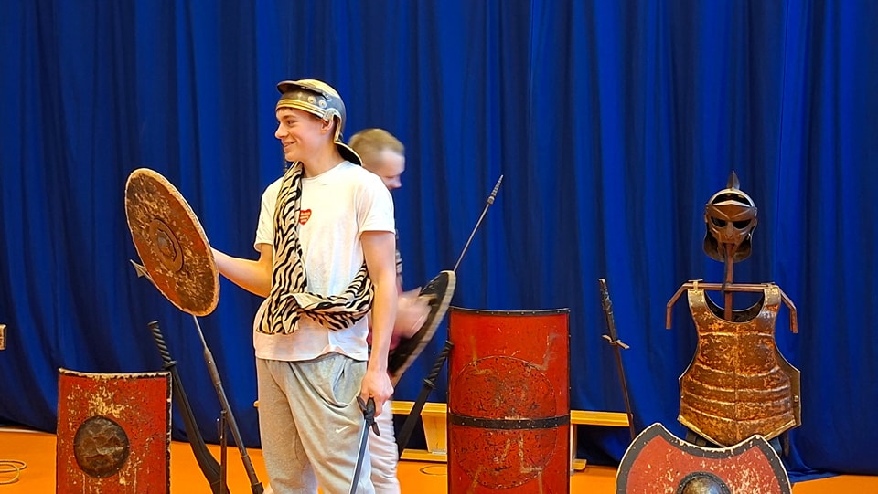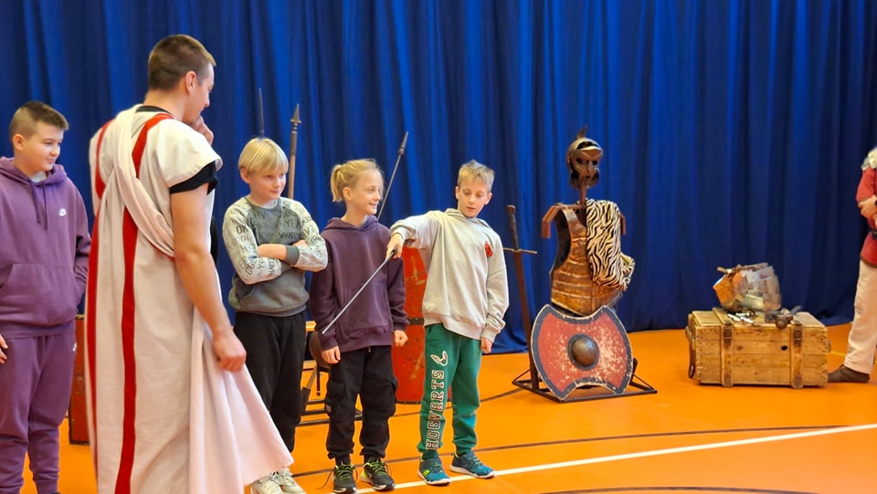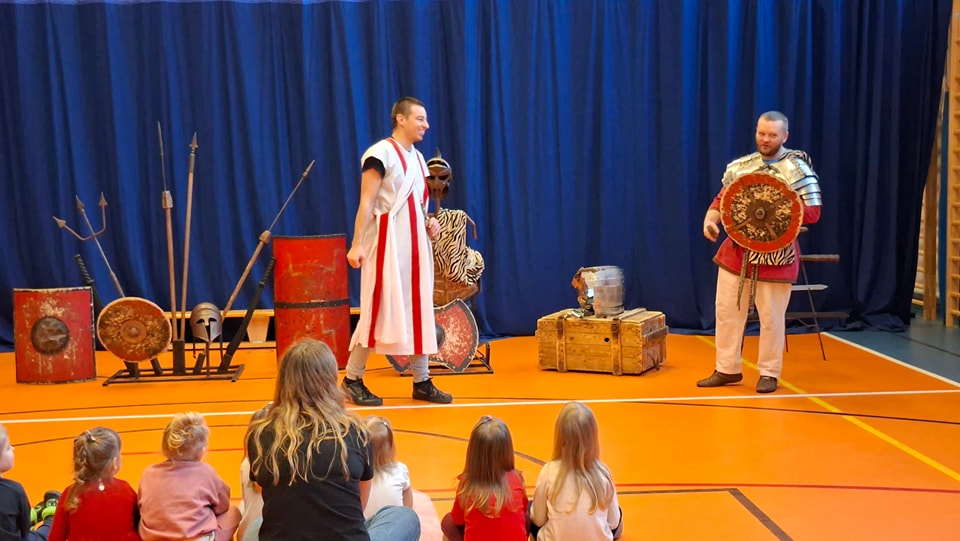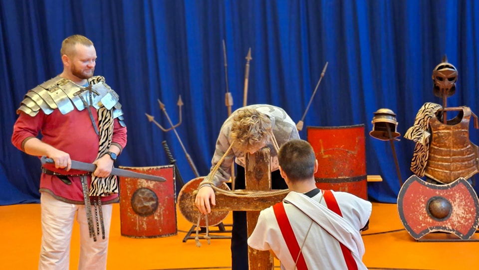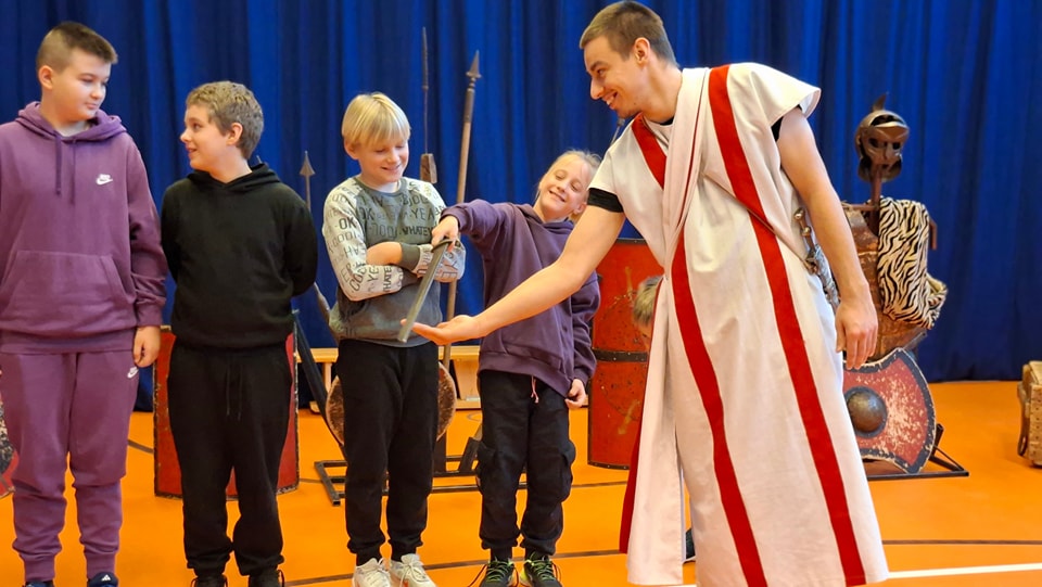 Do naszej szkoły zawitała Grupa Artystyczna Rekonstrukto, która przeprowadziła dla uczniów wyjątkową, żywą lekcję historii. Podczas spektaklu „Rzymskie Imperium i tradycje antyku” uczniowie z ogromnym zainteresowaniem poznawali dawne obyczaje i mogli w praktyczny, namacalny sposób doświadczyć kultury starożytnego Rzymu. Serdecznie dziękujemy za niezwykle ciekawe zajęcia! Panująca cisza i pogodna atmosfera były najlepszym dowodem na to, jak bardzo ta lekcja zaciekawiła naszych uczniów 🙂