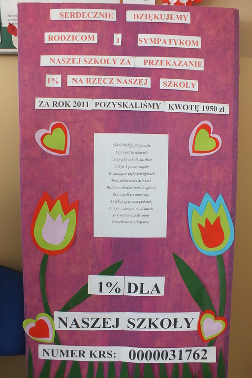 Również w tym roku zwracamy się z prośbą o wzięcie pod uwagę możliwości przekazania 1% Państwa podatku na Naszą Szkołę. Przekazane pieniądze mogą przyczynić się do lepszego wyposażenia szkoły w pomoce dydaktyczne, sprzęt sportowy itp., a tym samym wpłynąć na poprawę atrakcyjności zajęć prowadzonych w szkole i efektów kształcenia.