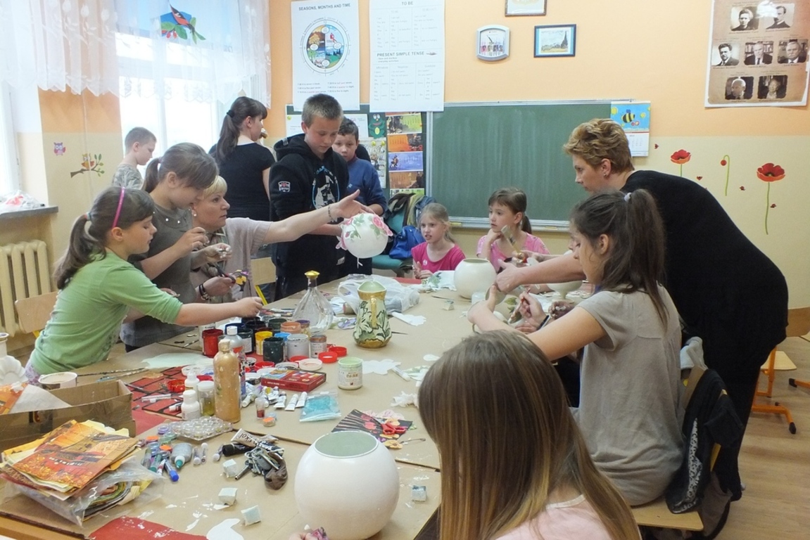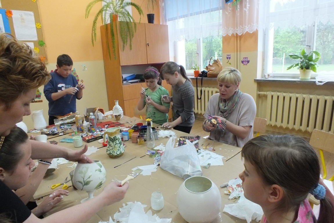 W sobotę, 11 maja 2013r. tradycyjnie w Naszej Szkole odbyło się spotkanie nauczycieli wraz z uczniami i rodzicami. Na zajęciach zwanych „Godzinka dla Rodzinki ” wspólnie tworzyliśmy przedmioty wykonane z drewna i ze szkła techniką decoupage.