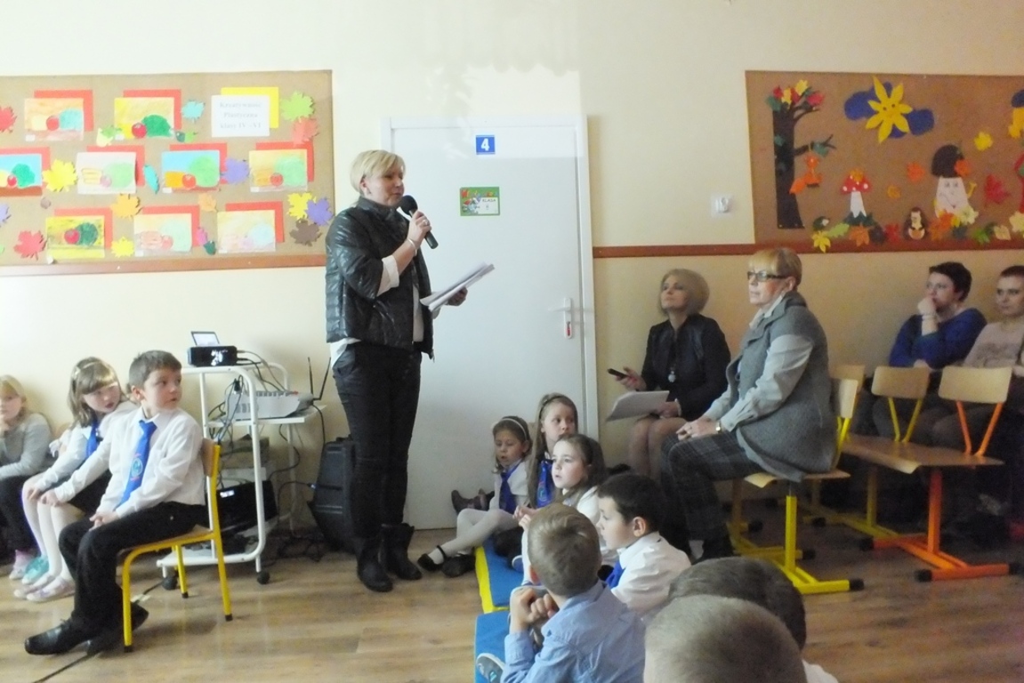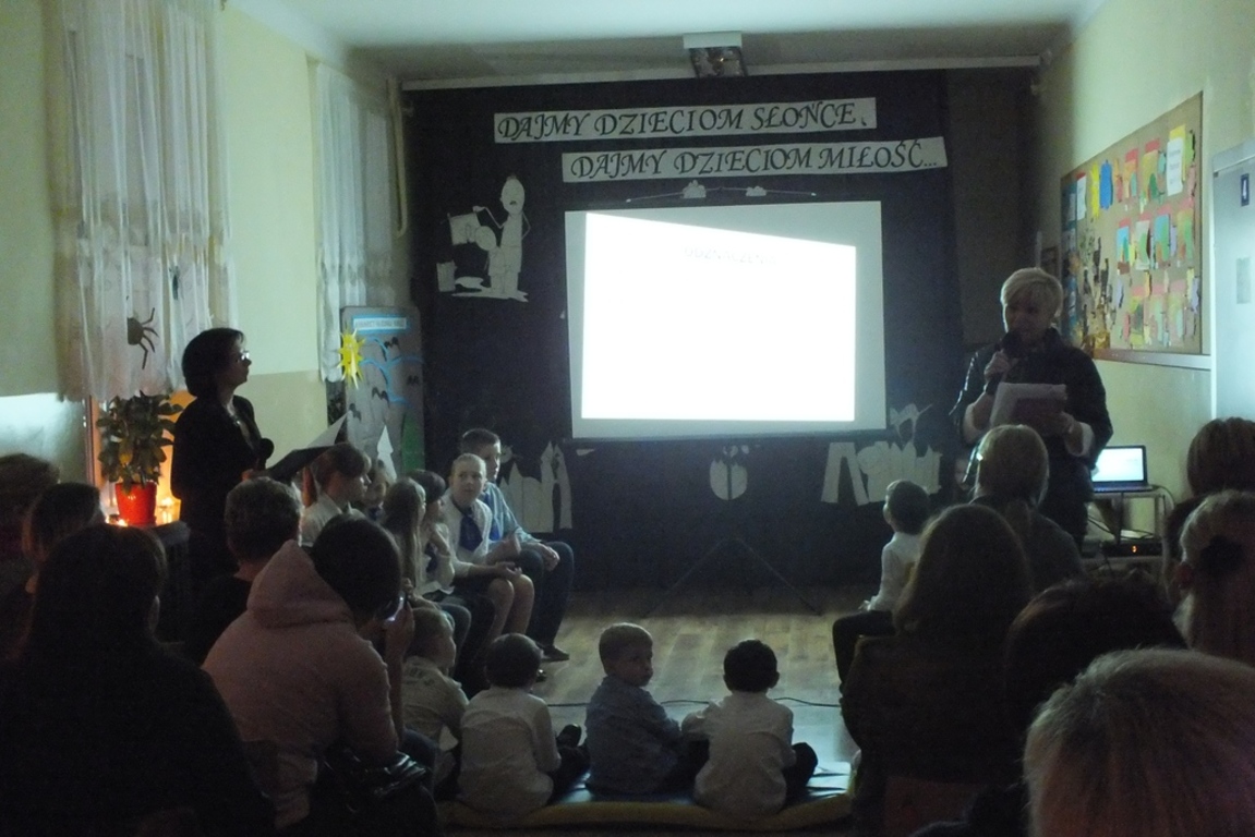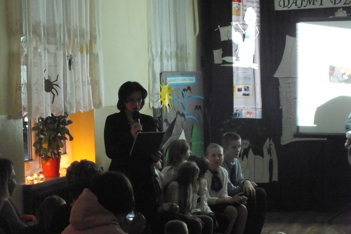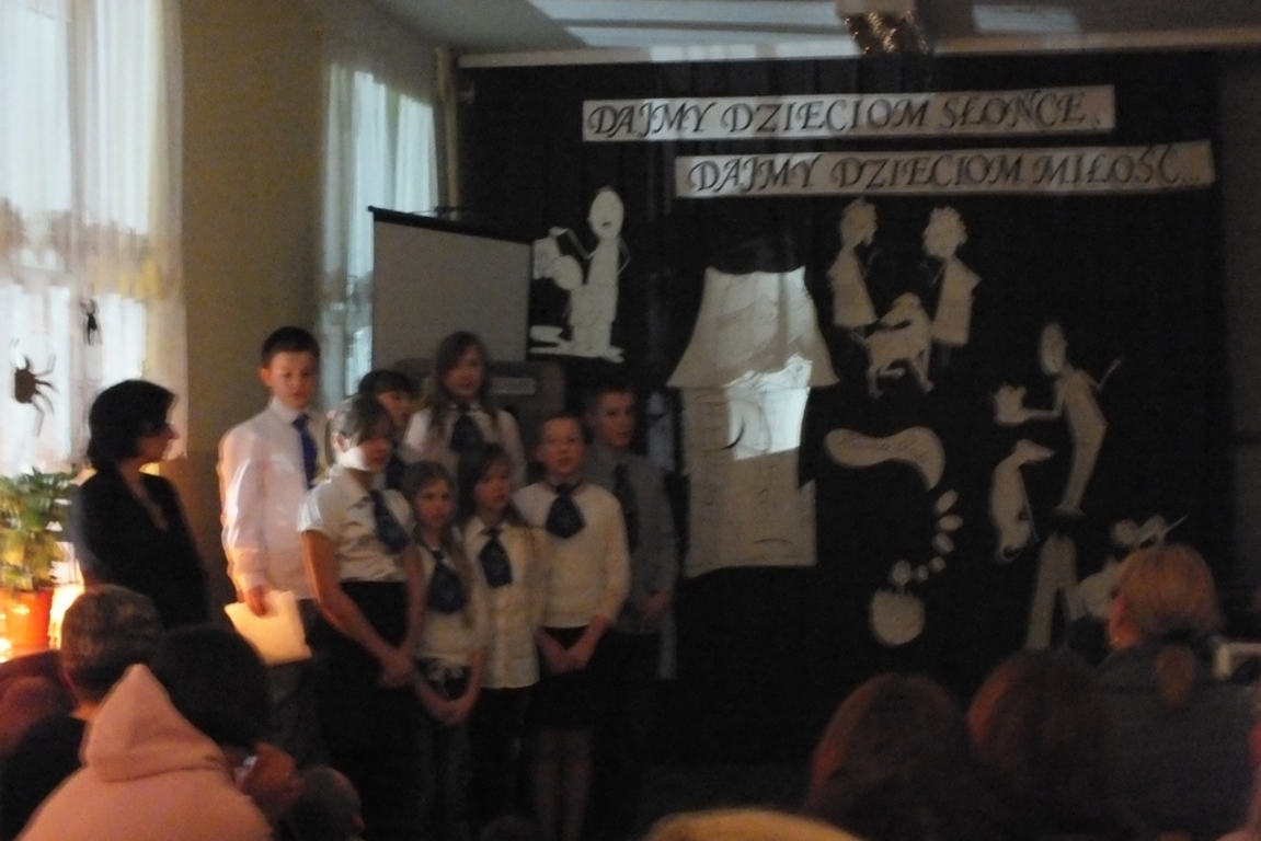 W przepięknej scenerii dzieci z klas I-V wprowadziły zgromadzonych widzów w cudowny świat poezji Pani Wandy Chotomskiej a prowadząca przedstawienie zdradziła mniej znane fakty i ciekawostki z życia pisarki. Całość okraszona była przepiękną muzyką. Wiele uśmiechów dostarczyła widzom kabaretowa wersja Czerwonego Kapturka w wykonaniu uczniów klasy V.