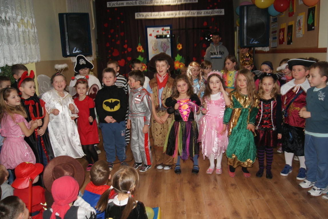Mimo zimowej aury panującej za oknami piątek 31 stycznia był wyjątkowo gorący. Tego wieczoru bowiem świętowaliśmy Dzień Babci i Dziadka a także, wierni szkolnej tradycji, bawiliśmy się na balu karnawałowym. Pierwszym punktem wieczoru było przedstawienie poświęcone zgromadzonym babciom i dziadkom w wykonaniu dzieci z klas 0-III. Maluchy z wielkim zaangażowaniem recytowały wiersze oraz śpiewały piosenki, czym zasłużyły na liczne owacje.