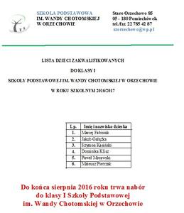 LISTA DZIECI ZAKWALIFIKOWANYCH DO KLASY I W ROKU SZKOLNYM...
