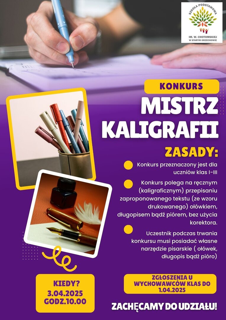 3 kwietnia chętni uczniowie klas I-III wezmą udział w konkursie ortograficznym "Mistrz kaligrafii". Zachęcamy do udziału!
